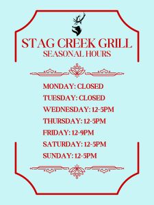 Our Stag Creek Grill Hours are as follows: